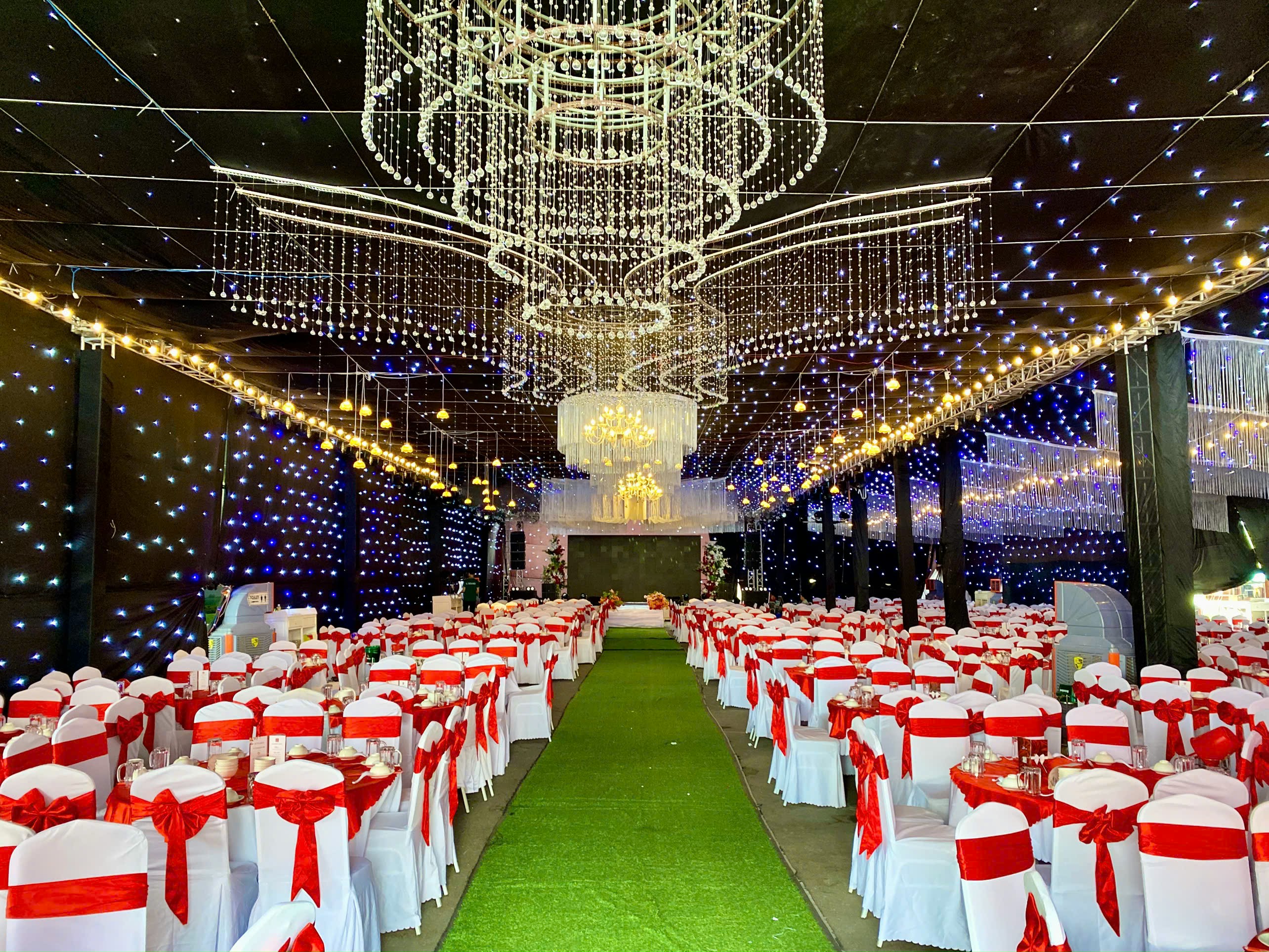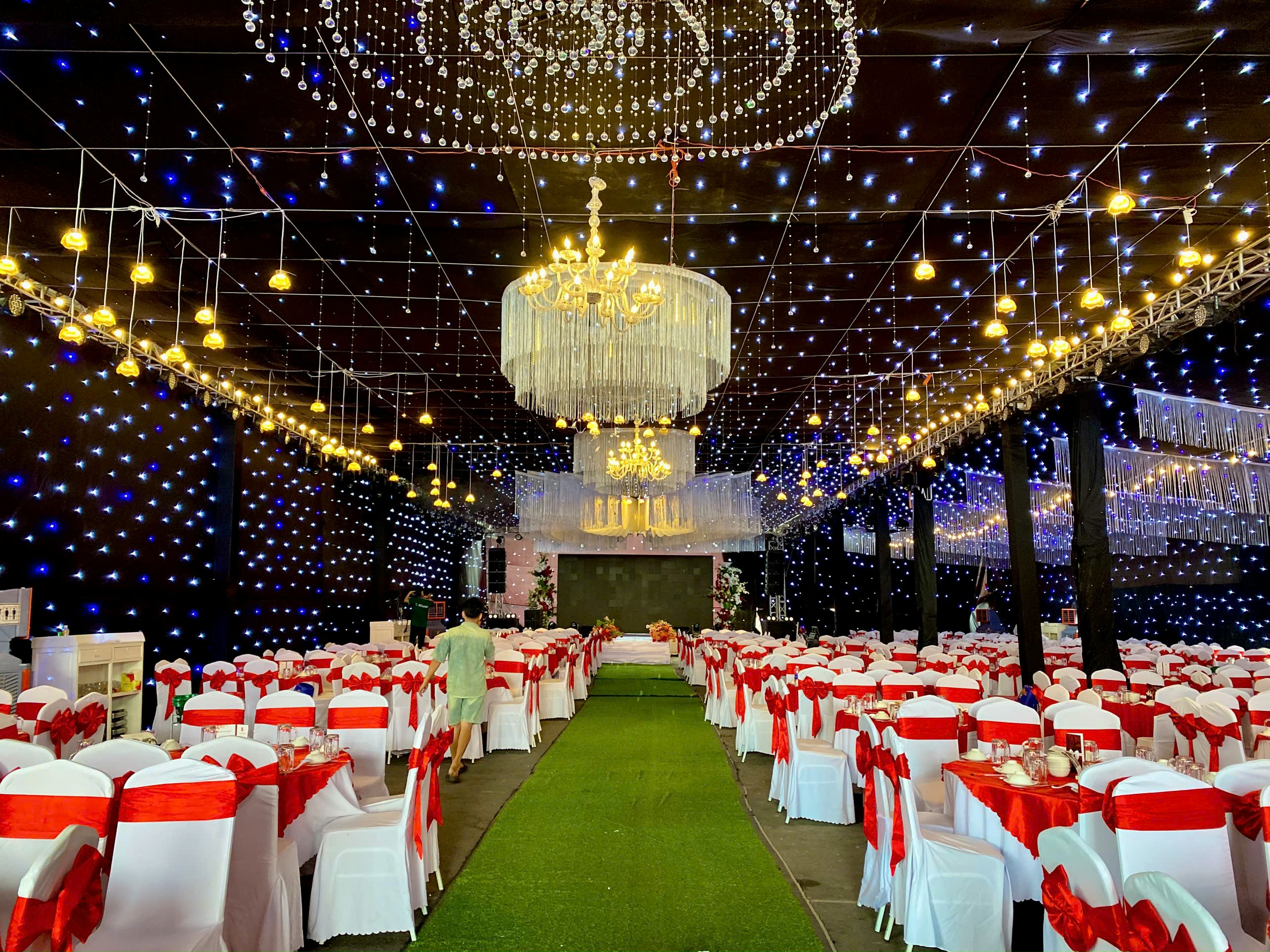 Bước vào khu vực tiệc, khách mời sẽ choáng ngợp trước không gian rộng lớn và lộng lẫy. Hệ thống đèn chùm pha lê kết hợp cùng ánh đèn LED tạo hiệu ứng như bầu trời đầy sao, mang lại cảm giác vừa ấm áp vừa lãng mạn. Với sức chứa khoảng 100 bàn tiệc, không gian nơi đây đủ rộng rãi để đón tiếp đông đảo quan khách mà vẫn đảm bảo sự thoải mái, trang trọng. Hàng trăm bàn tiệc phủ khăn trắng tinh khôi, điểm xuyết nơ đỏ nổi bật, được bố trí ngay ngắn và hài hòa – tất cả tạo nên một bữa tiệc cưới đẳng cấp, lung linh và đầy cảm xúc. Thực đơn tiệc cưới được lựa chọn kỹ lưỡng, hội tụ những món ăn thượng hạng, trình bày tinh tế và hương vị hấp dẫn, mang đến trải nghiệm ẩm thực trọn vẹn cho mỗi vị khách.