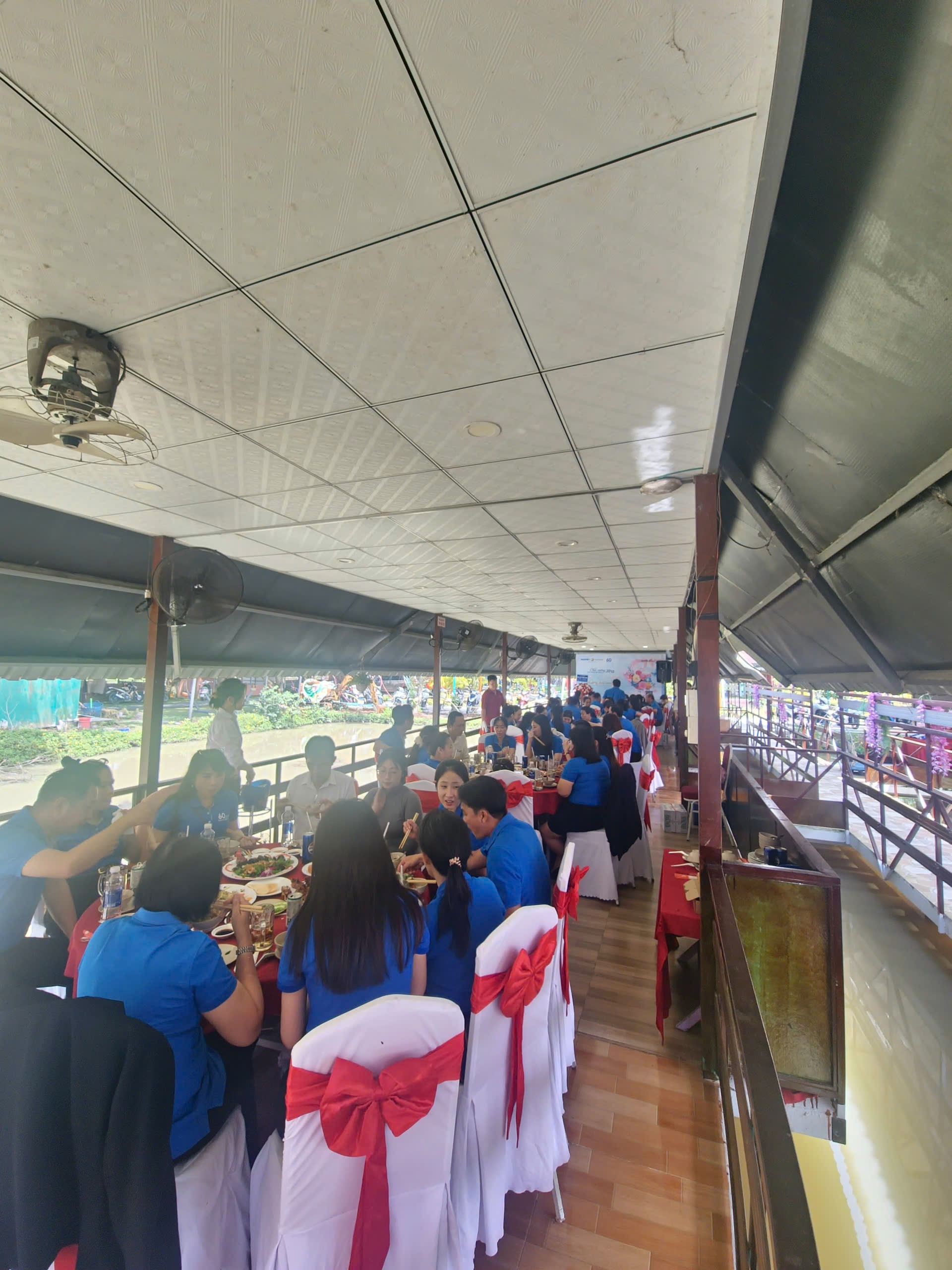 Khu du lịch Phú Điền gây ấn tượng với không gian xanh mát, thoáng đãng. Bao quanh là hàng cây xanh rì, làn gió nhẹ từ mặt sông và tiếng nước róc rách mang lại cảm giác thư giãn, gần gũi với thiên nhiên. Khu vực ăn uống được bố trí rộng rãi, thoáng khí và dễ dàng kết nối giữa các bàn tiệc, giúp mọi người vừa thưởng thức ẩm thực vừa trò chuyện, giao lưu trong bầu không khí vui tươi, thân mật. Sự tinh tế trong cách bài trí, tông màu đỏ – trắng nổi bật cùng dịch vụ chu đáo đã góp phần tạo nên một buổi tiệc ấm cúng, đầy ắp tiếng cười.